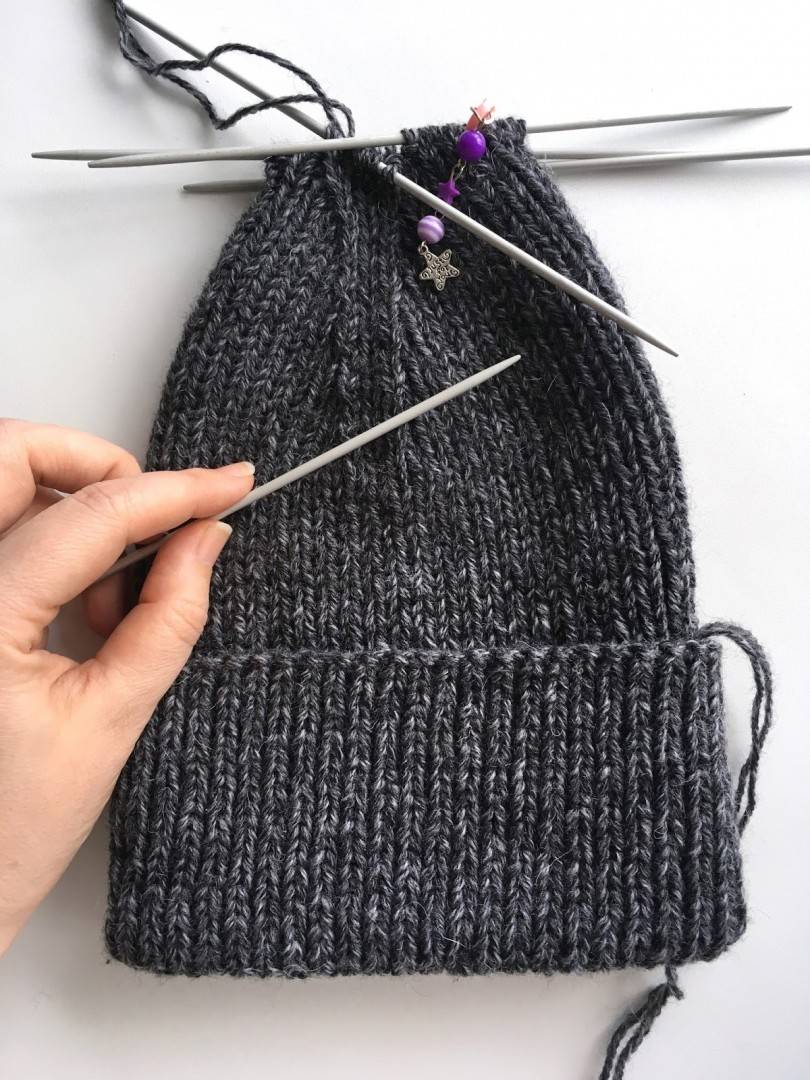Шапочки обычно вяжутся на круговых спицах – так изделие получится гладким, без швов. Резинка для плотности вяжется на тонких спицах. Переходя на вязку основания, нужно сменить спицы на более толстые и добавить петли.