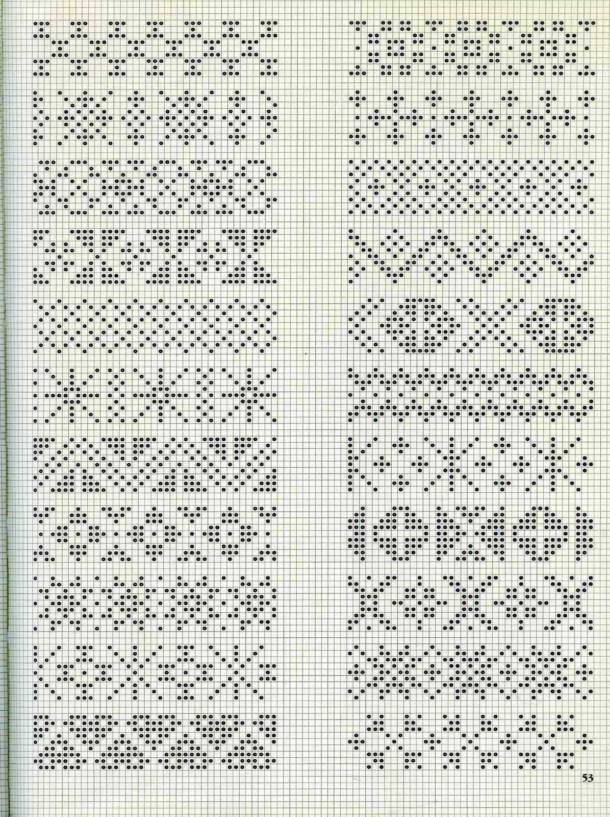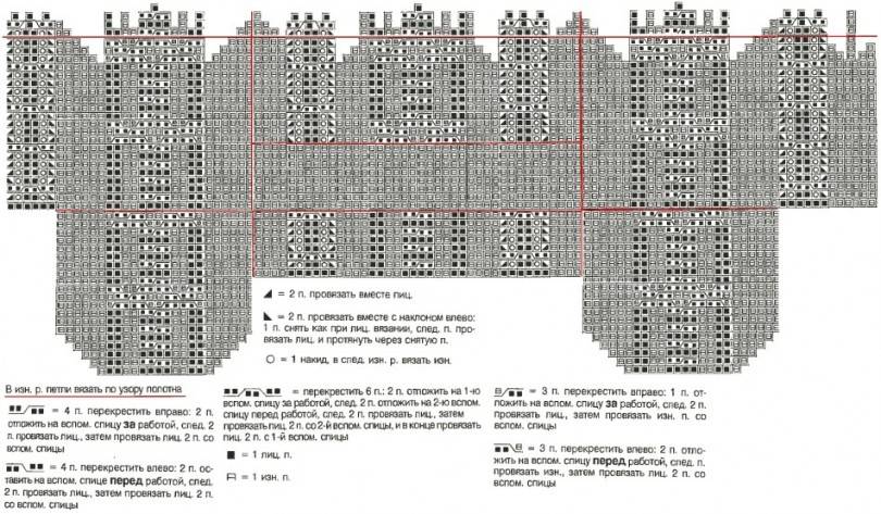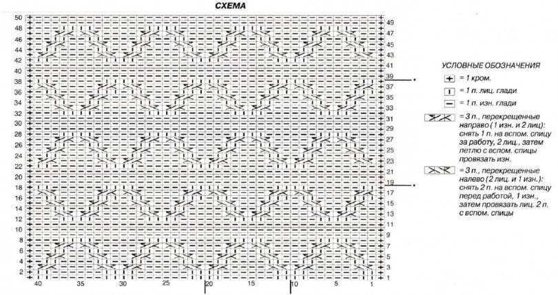 2изн., накид, 1лиц., накид, 1лиц., 4изн., узор по схеме, 4 изн., узор по сх., 4изн., 1лиц., накид, 1лиц., накид, * 4изн., накид, 1лиц., накид, 1лиц. * — повторить от * до * 3р, 4изн., 1лиц., накид, 1лиц., накид, 4изн., узор по сх., 4 изн., узор по сх., 4 изн., 1лиц., накид, 1лиц., накид., 2 изн. (=88п.) - Продолжайте вязать по рисунку. Над 4 изн. вяжите изнаночными, между ними — узоры с косами. 11 раппортов в высоту.