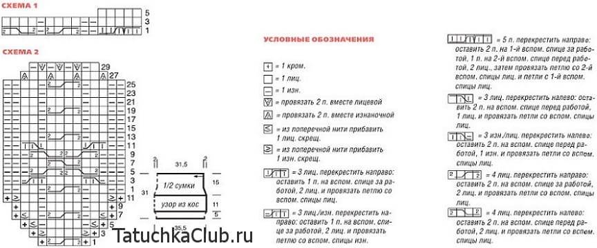 15 п. платочной вязки, 16 п. узора «косы 1», 5 п. платочн.вязки. - Вяжите 63 см прямо и закройте петли. Сложите вязание пополам, сшейте боковой и нижний края. Пришейте ручки.