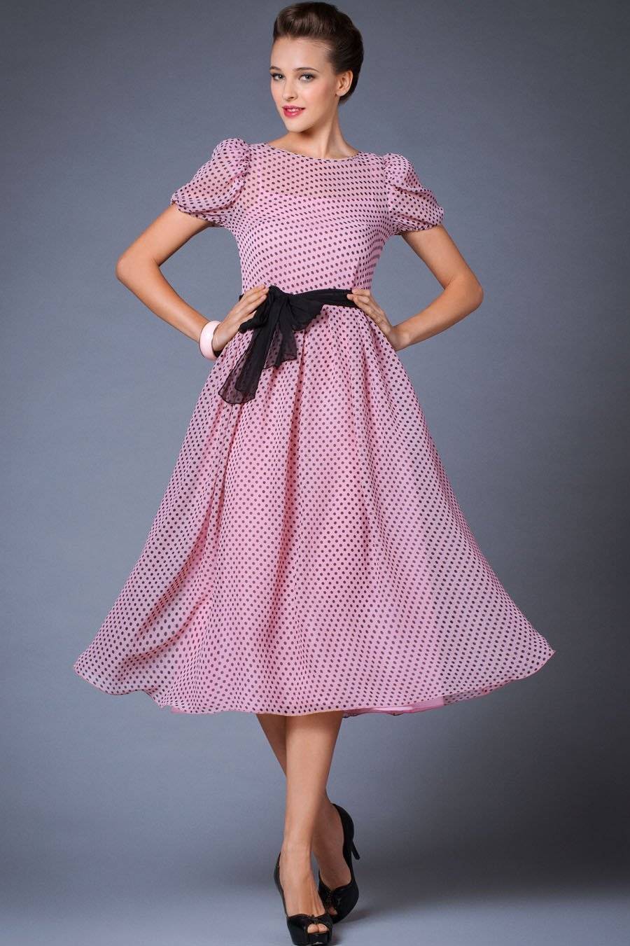 И для повседневной носки, и для торжества подойдут платья в стиле «ретро» с пышной юбкой. Их отличительной чертой является интересный узор на ткани — мелкий и крупный горох, цветочный принт, вишни, банты.
