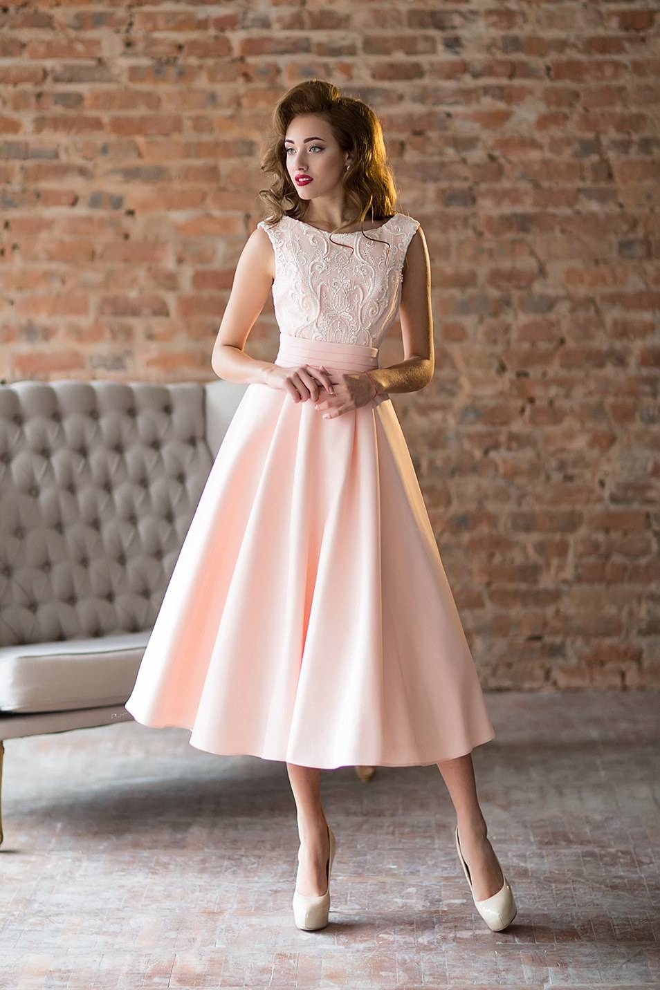 - Старайтесь выбирать либо короткую пышную юбку, либо чуть выше или чуть ниже колен. Избегайте опасной длины, которая идет до середины икры! Также вы можете выбрать длину в пол.