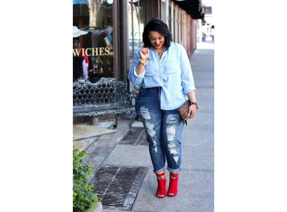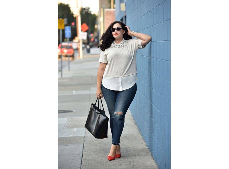 Джинсы. Пышки могут себе позволить, как прямые модели, так и клёшеные варианты, изделия длиной в пол или укороченные. Что касается всеми любимых скинни, они хоть и допустимы для полных женщин, всё же с ними следует быть аккуратными, так как они могут подчеркнуть недостатки фигуры.