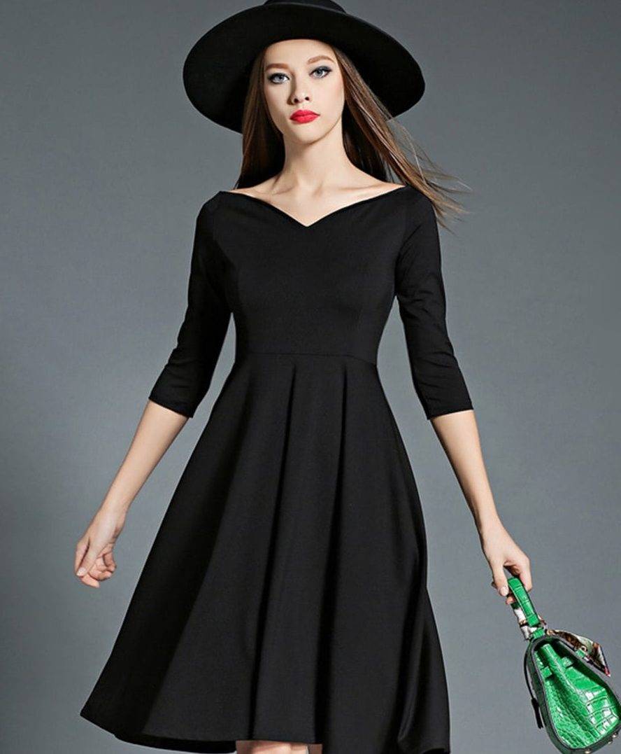 Платья А-силуэтов или с воздушной юбкой могут отвлечь от очень широких плеч. Также можно выбирать наряды с V – образным декольте.
