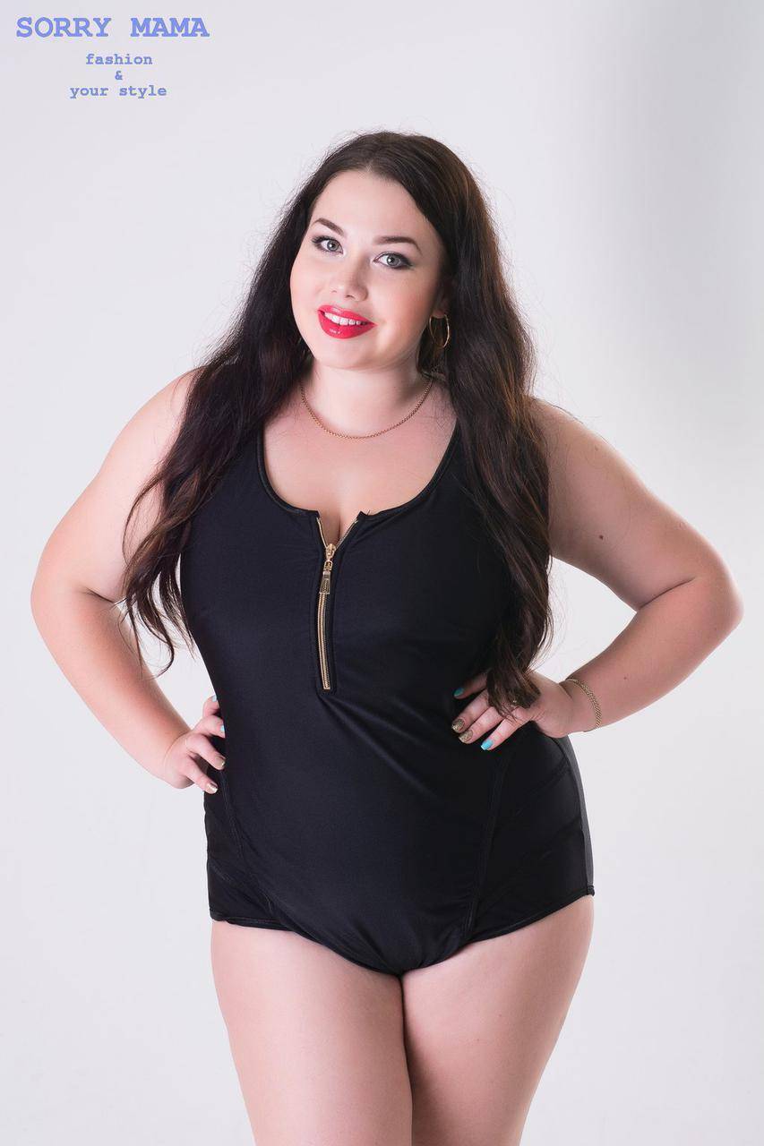 Излюбленной моделью пышек является сплошной купальник, максимально закрывающий тело. В такой модели можно выгодно подчеркнуть красоту женского тела и спрятать некоторые ее изъяны. Модельеры решили компенсировать полноту с помощью сложного кроя из тканей двух цветов, одним из которых всегда был черный. Эффект стройности стал возможным в слитных моделях с помощью горизонтальной драпировки в зоне живота и прямоугольных вставок из ткани черного цвета на боках.