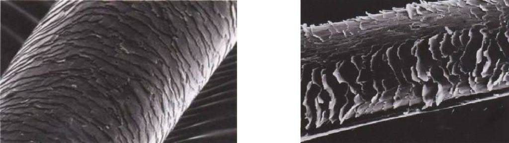 В повреждённом волосе чешуйки не склеены, в результате чего из тела волоса теряется влага и другие полезные компоненты