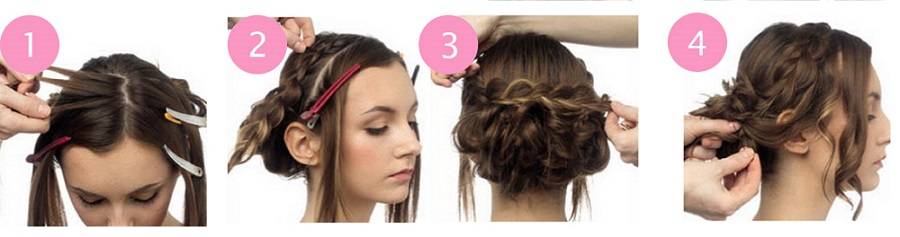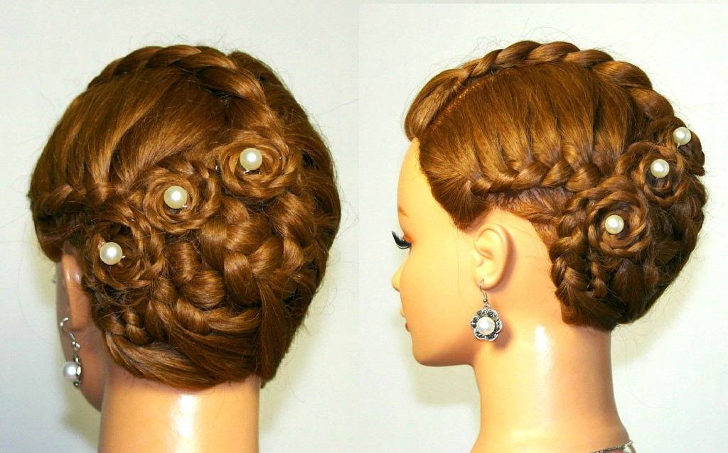 Укладка такого типа выглядит очень празднично и женственно. С ее помощью можно выгодно подчеркнуть декольте и продемонстрировать красивую шею. Для украшения можно воспользоваться цветами и стразами.