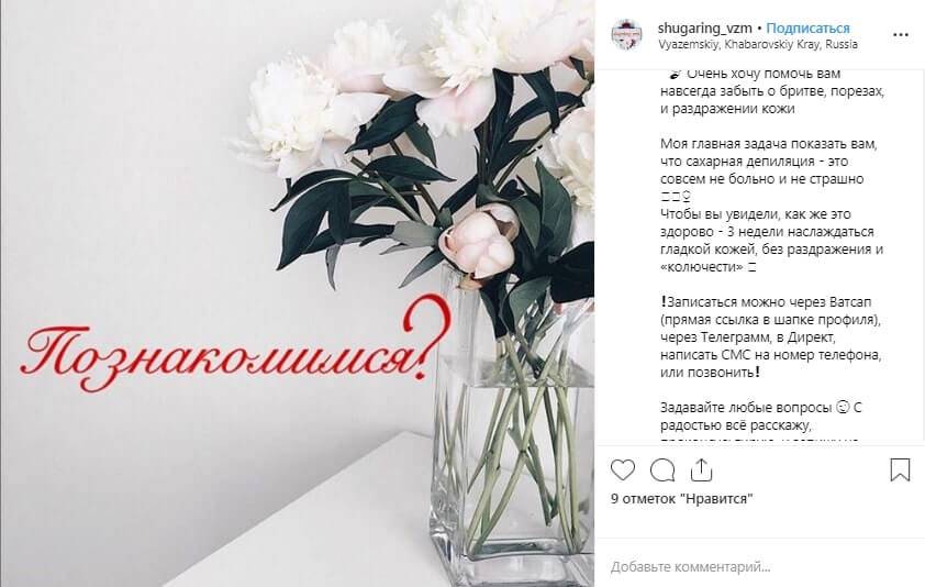 Предоставьте данные о компании: что вы производите и продаёте, плюсы услуги? Посмотрите, как эта информация подана в публикации мастера шугаринга.