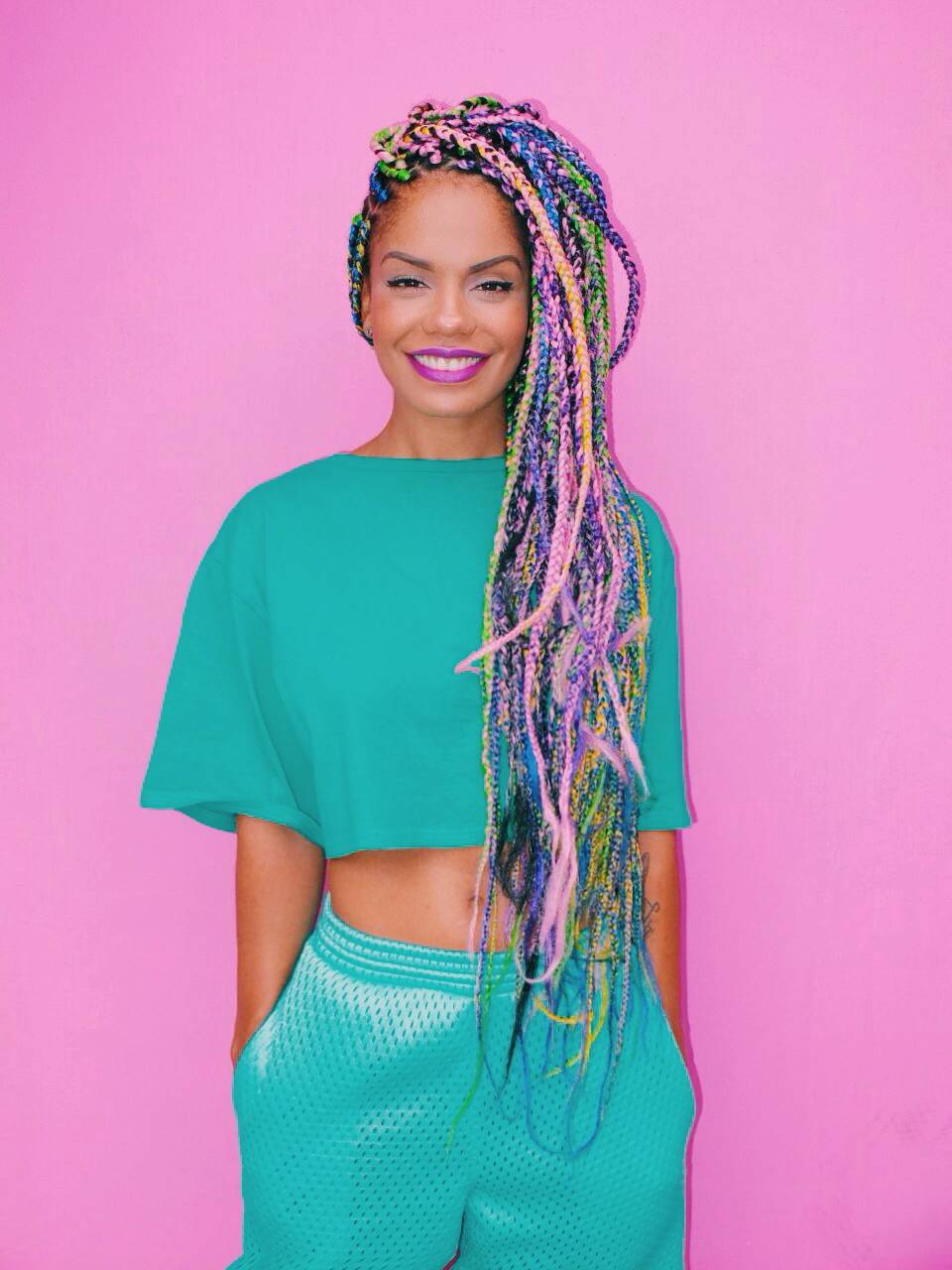 В моде косички с цветным канекалоном. Остановитесь на короткой или средней длине и добавьте цветные акценты, например фиолетовый, синий, зеленый или красный.