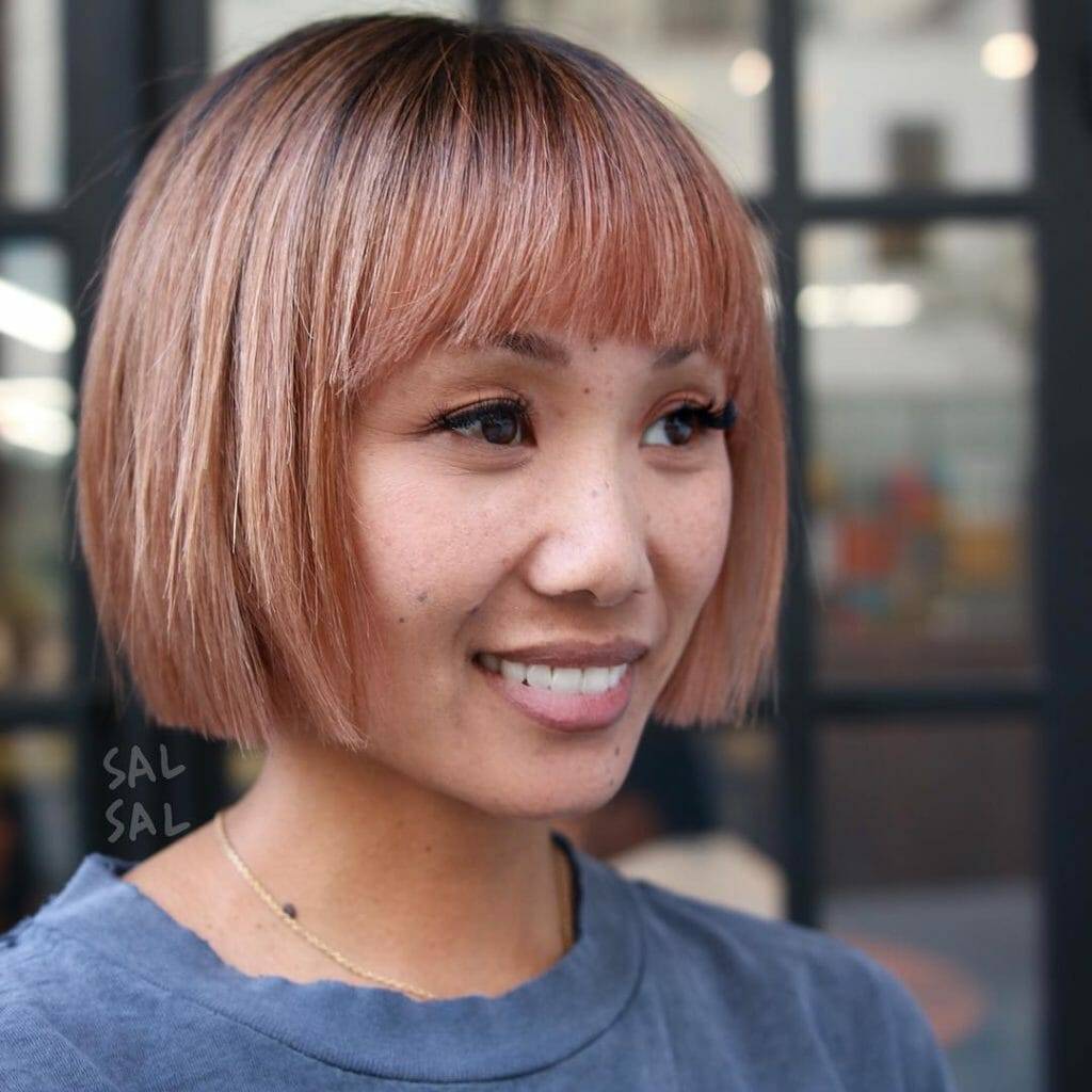 Асимметричный или ровный боб выглядит одинаково хорошо на любых волосах средней длины. Его носят как с челкой, так и без.