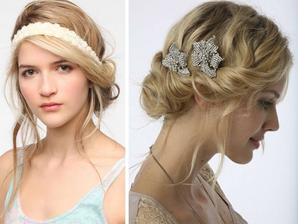 Важнейшим элементом построения причёски на коротких волосах станут, конечно же, украшения. Благо вариантов великое множество: заколки с декоративными цветами, женственные и милые ободки, диадемы, украшения с перьями и бусинками, резинки-повязки или свадебные обручи, богато украшенные камнями, живые цветы или веночки с нежными декоративными цветочными элементами, разнообразные вуалетки, шляпки-таблетки.