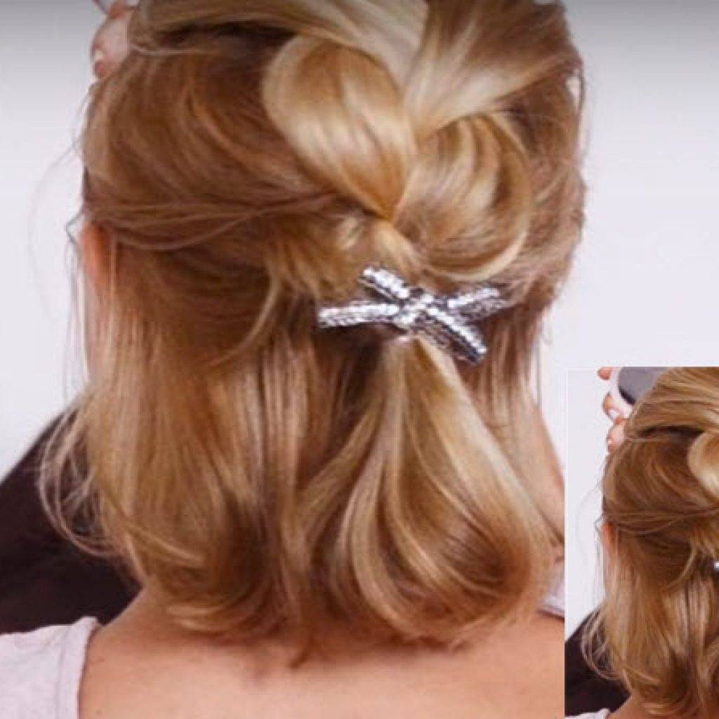 Еще одна простая и быстрая прическа за 5 минут не требующая плетения. Попробуйте сделать просто объемную прическу, завернув расчесанные от макушки волосы во во внутрь, и заколов их красивыми заколками. Получится очень интересный вариант прически за 5 минут.