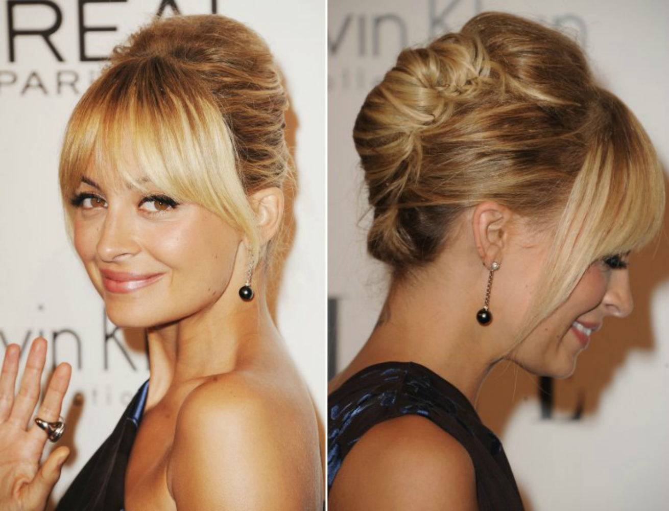 Такая прическа отлично смотрится с челкой, а если у вас ее нет, то оставьте тонкую широкую прядь в районе лба, а затем разделите ее на две стороны и сбрызните лаком, оставив свободно свисать вниз.