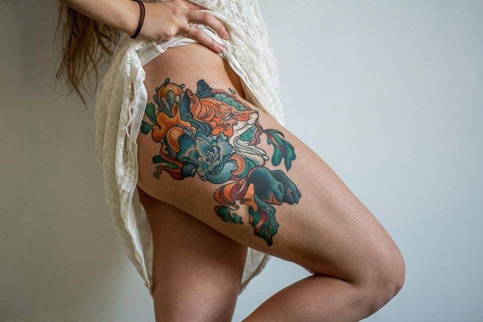 Тату змея в розах на бедре у девушки символизирует невозможность противостоять искушению. Поэтому перед нанесением такого тату следует обдумать