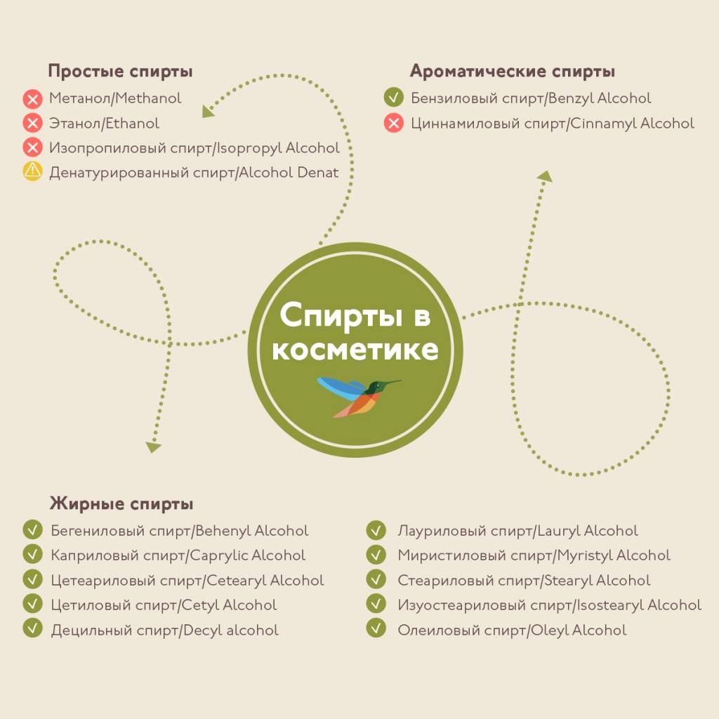 С осторожностью — денатурированный спирт, за исключением сертифицированной органической косметики, где в общей формуле он безопасен. Не нужно бояться ароматического бензилового спирта, а также всех жирных спиртов, перечисленных в нашей статье»