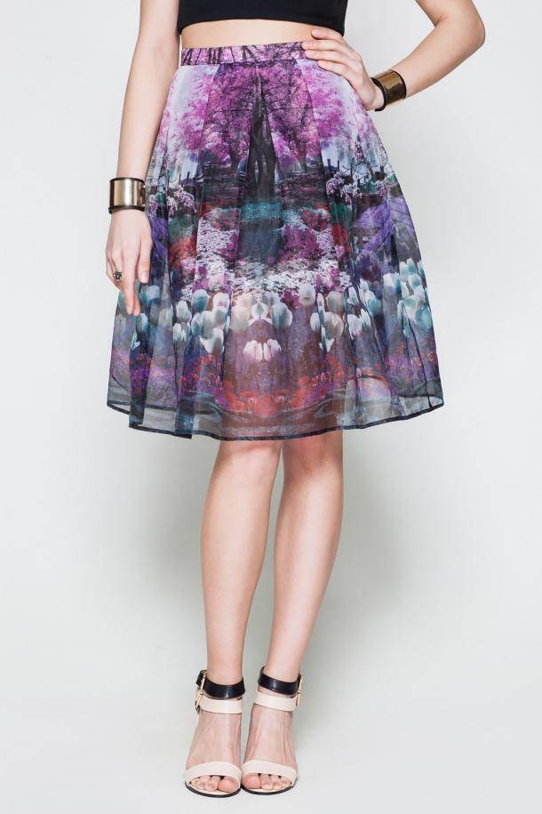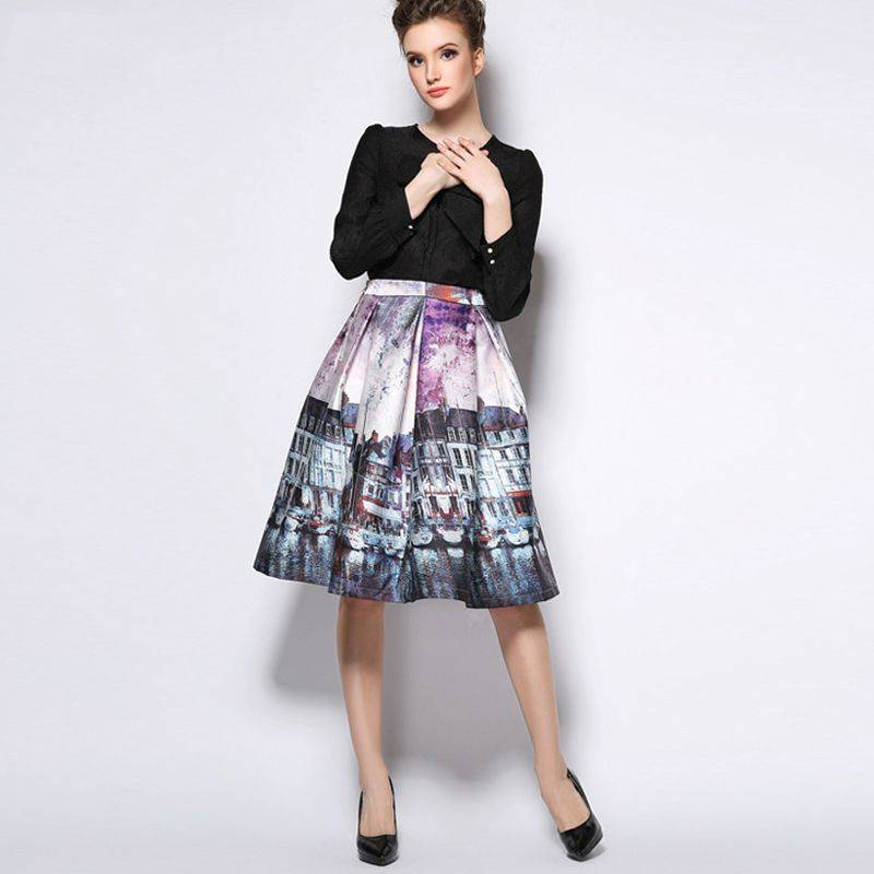 Трендом сезона стали юбки с изображением городов, знаменитых картин, нанесенных по кругу. Причем картинка не повторяется, а в развороте представляет целую картину.