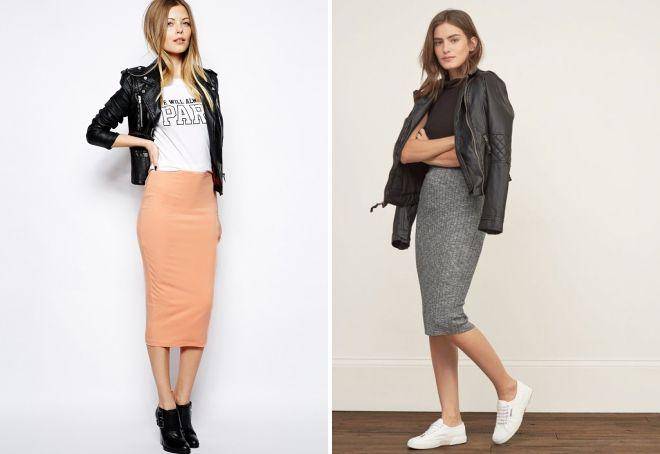 Большинство представительниц прекрасного пола выбирают низ средней длины. Юбку легко сочетать с топом, кардиганом жакетом.