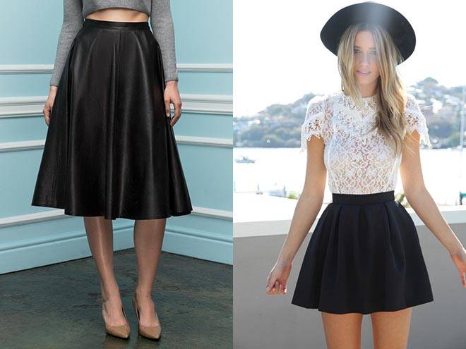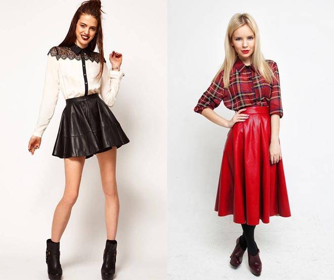Кожаная юбка колокол универсальна и не выйдет из моды. Кожу желательно комбинировать с легким верхом из других материалов — футболкой, облегающей майкой, трикотажным топом. С кожаным верхом будете выглядеть вульгарно.