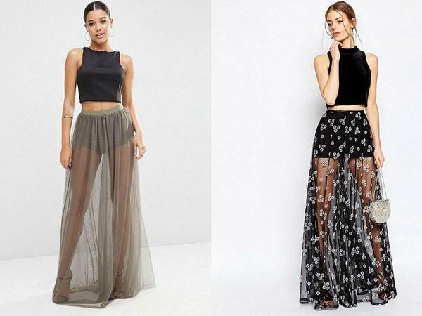Полупрозрачная шифоновая или кружевная юбка в пол идеально сочетается с коротким топом, помогая создать изящный образ для особого вечера.