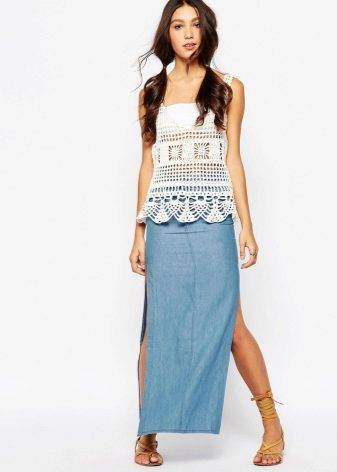 Деним отлично держит форму, благодаря своей плотности идеально подходит для длинных джинсовых юбок годе. Дизайнеры часто прибегают к применению ассиметричного подола. Характерен он для летних юбок-годе с запахом или боковым каскадом.