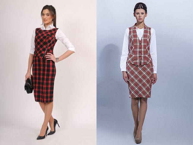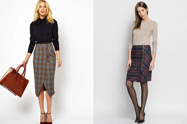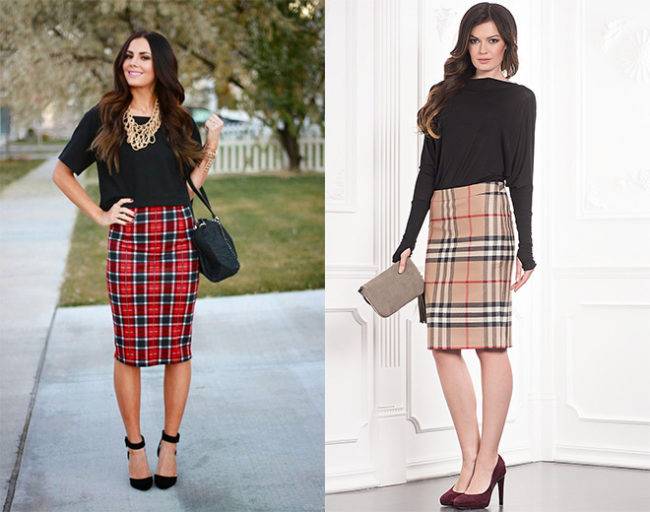 Для создания делового образа юбка-карандаш в клетку рекомендуется выбирать в коричневых, темно-синих или красных тонах
