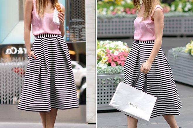 Полосатая юбка-колокол подчёркивает изящность ног, не смешивайте полосы с яркими принтами топа, акцентируйте внимание на юбке. Выберете на верх что-то нейтральное, однотонное