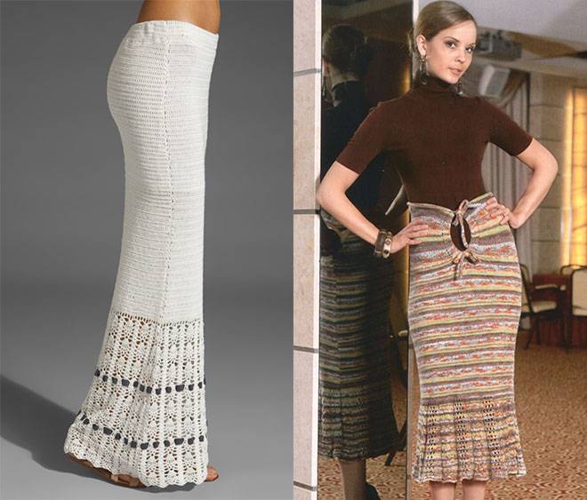 Для вязаных юбок годе характерен прямой силуэт с расширением книзу в виде клиньев. Прямые вязаные модели идеальны лишь на стройных девушках, от длины ничего не зависит. Вязаная юбка годе гармонично сочетается с приталенными пиджаками и жакетами. Прекрасно смотрятся с однотонными водолазками и тонкими свитерами, приталенными рубашками, а так же кардиганом.