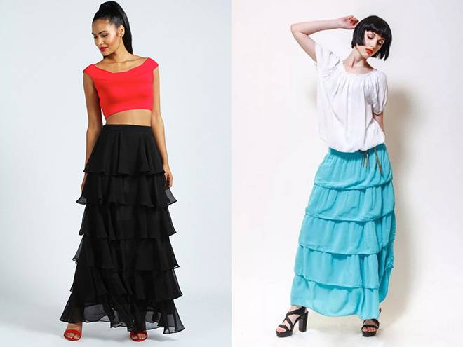 Юбка из воланов. Состоит из ярусов, каждый из которых кроится шире, чем предыдущий, верх обычно крепится на резинке. За счет сборки получается пышная юбка с красивыми оборками. Этот фасон лучше шить из шифона, штапеля, кружев и фатина. Подходит для полных женщин, можно носить в летний сезон.