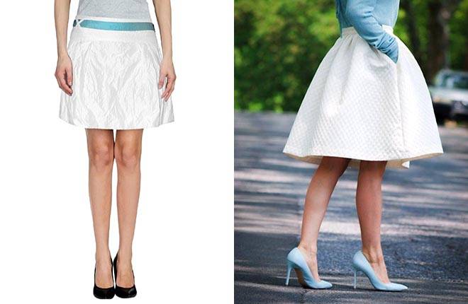 Белая юбка-колокол – это лёгкий, поистине летний образ. В сочетании с хорошим загаром и аксессуарами выглядит потрясающе. Белый низ смело сочетайте с белым верхом, главное, чтобы ткань различалась по фактуре. Для создания нежного образа к белой юбке подберите кремовый оттенок: пепельно-розовый, кремово-бежевый, кофе с молоком. Так же подойдут джинсовые сине-голубые оттенки. Черно-белый стиль – классика модного жанра. Черный топ и белая юбка задают контраста. Черный на фоне белого становится глубже и насыщеннее. Белый на фоне черного становится сияющим и ослепительным.