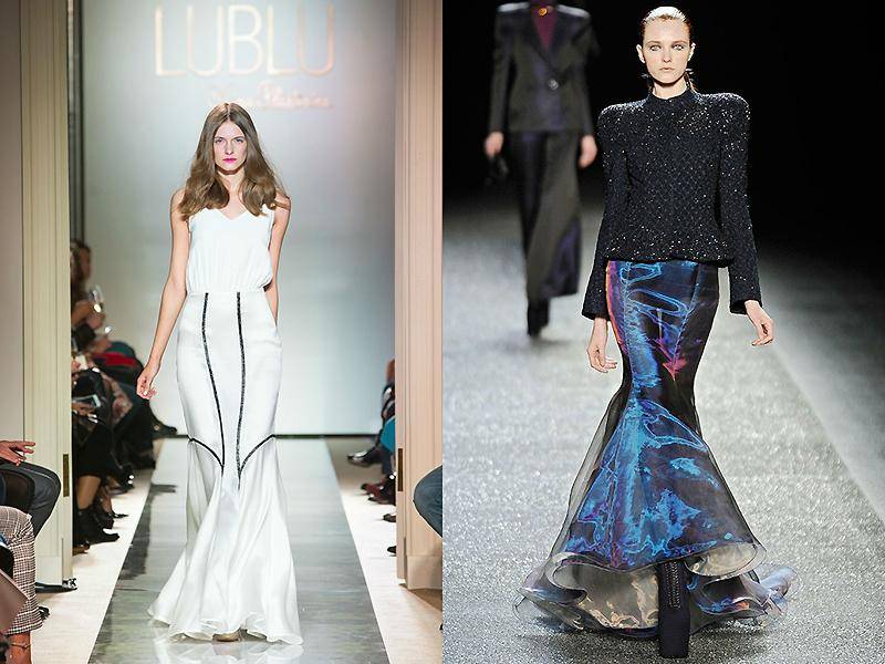 Невообразимо красиво с длиной в пол сочетаются, возвращающиеся в моду, воланы. В тренде многослойные юбки и геометрические асимметричные линии низа.