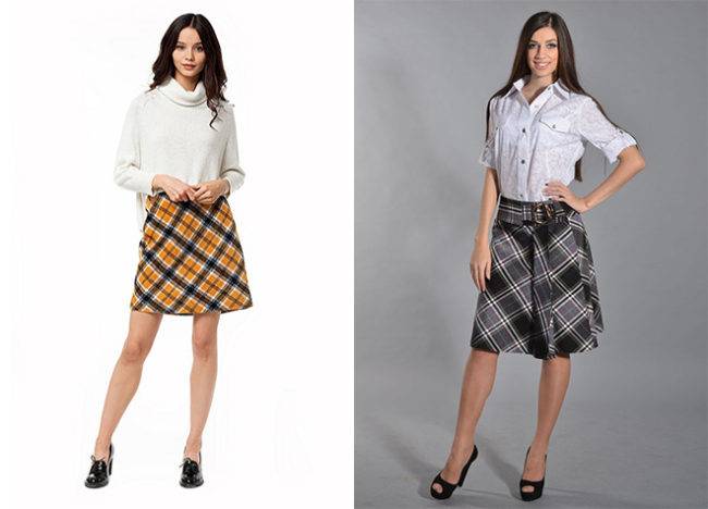 Клетчатая юбка-трапеция поможет создать сдержанный спокойный образ. Эта модель хорошо сочетается с однотонными водолазками, блузками, рубашками, пиджаками, вязаными кардиганами. Красиво смотрится на женщинах любого возраста. Молодые девушки могут позволить себе модели мини, а женщинам постарше рекомендуется выбирать длину миди.