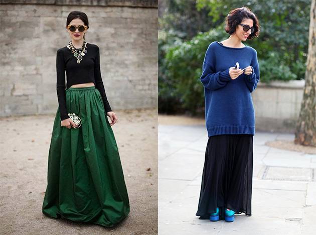 Пропорции нижней части тела и верхней должны визуально составлять 1:4 или 1:3, именно так получится выглядеть выше и стройнее. То есть длинные юбки требует более короткого верха. Пропорции можно перевернуть и надеть к юбке длинный кардиган, на многих модных показах такой вариант встречается, но не забывайте про высокий рост девушек на подиуме. Поэтому, если есть уверенность в результате эксперимента, то сочетайте такую юбку с длинным и объемным свитером или жакетом свободной модели.