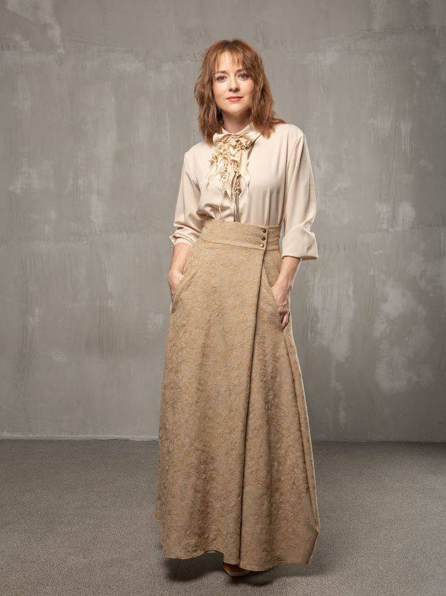 Выполненная в нейтральном бежевом цвете юбка годе, в зависимости от подбора материала, подойдет для повседневной носки, офиса или торжества. Наиболее гармонично сочетается с белым или кремовым верхом.