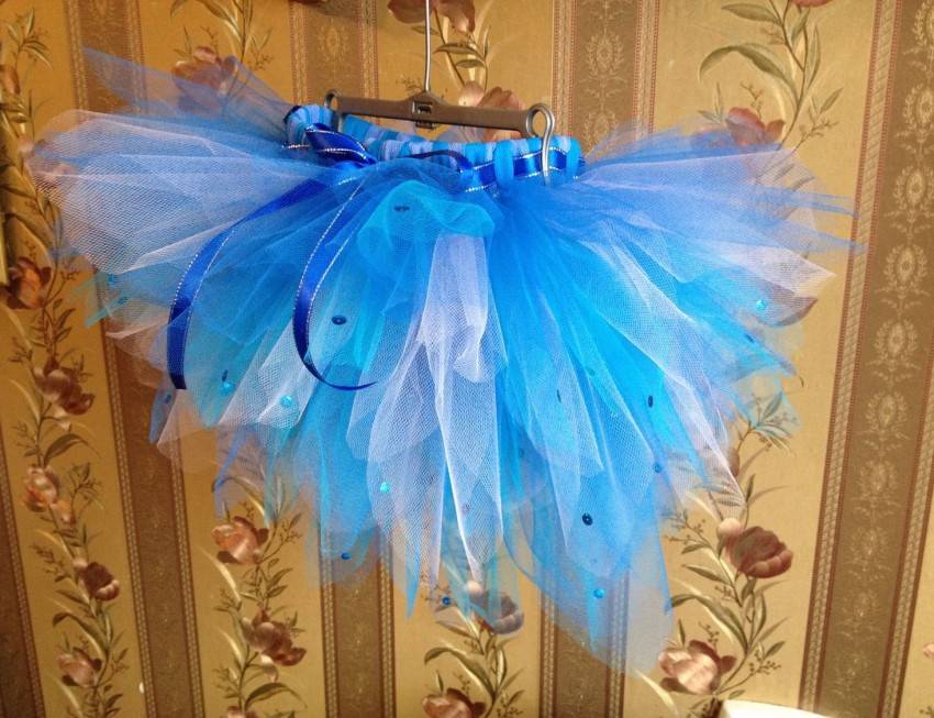 Рассмотрим, как пошагово сшить юбку-пачку в пол. Для изготовления такой юбки необходим фатин длиною 80–100 см. В нашем примере мы шьем яркую синюю юбку-пачку, которая будет иметь переливы тонов.