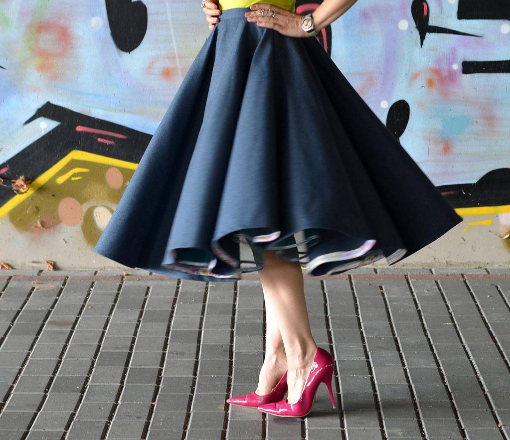 - По внешнему виду юбка-солнце очень пышная и крупная. Многие девушки покупают даже более больший вариант, делая разные складки.