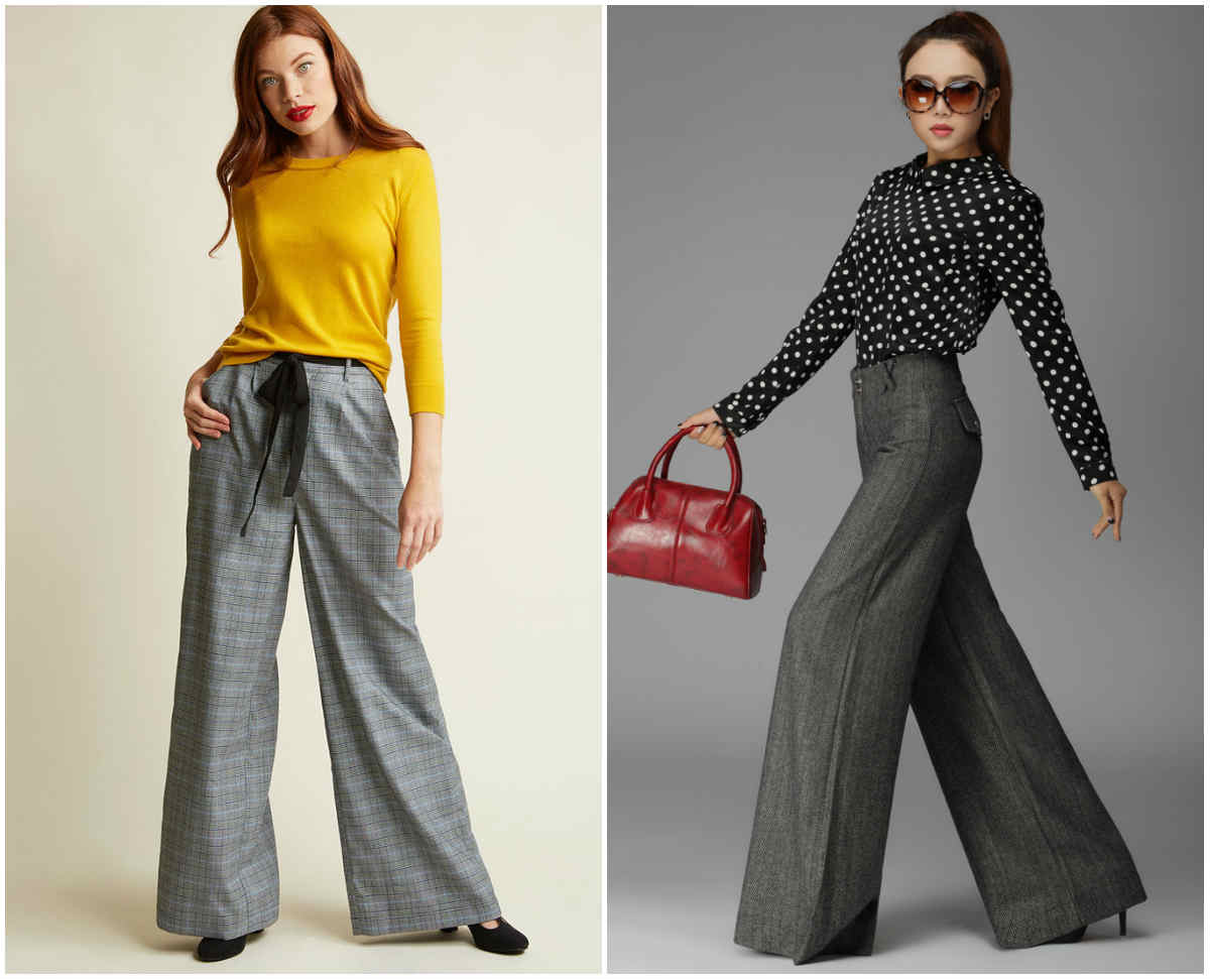 — брюки с малозаметным расширением штанин и свободные матросские клеши. В 2017-2018 году актуальность получили расклешенные брюки в пол