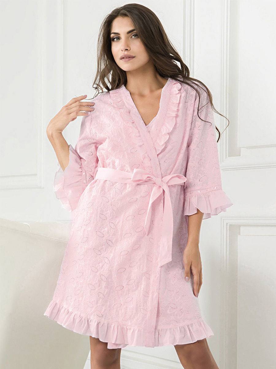4. Фасон кимоно. Напоминает традиционное японское кимоно, но более домашнего стиля, украшенное рюшами, оборками, гипюром. Под этот тип можно отнести все лёгкие и декорированные запахивающиеся халаты с поясом. Они могут быть как в пол, так и короткими.