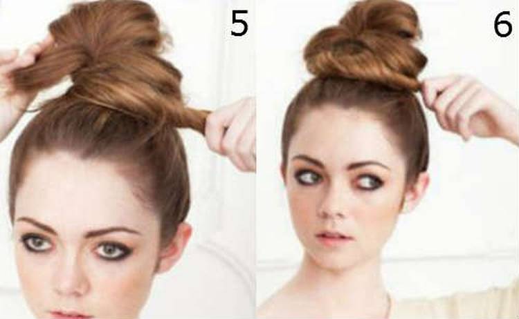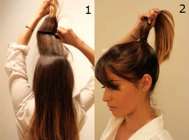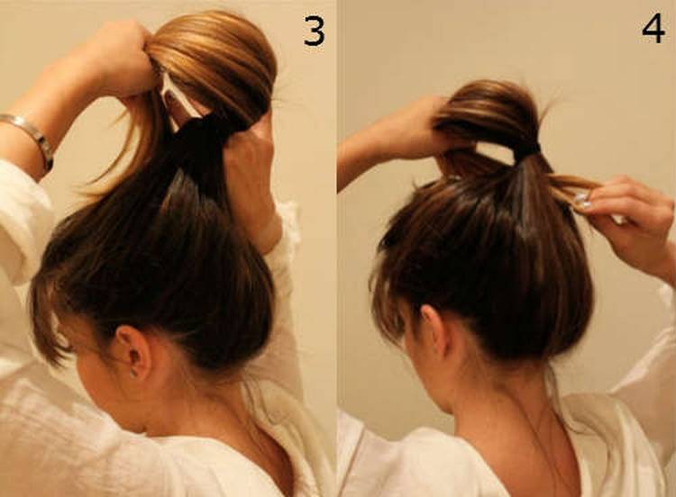 - Собираются волосы на макушке в высокий хвост, при последнем обороте резинки волосы протягиваются немного вверх, образуя волосяную подушку (делать ее слишком высокой не нужно, иначе пучок потеряет объем).
