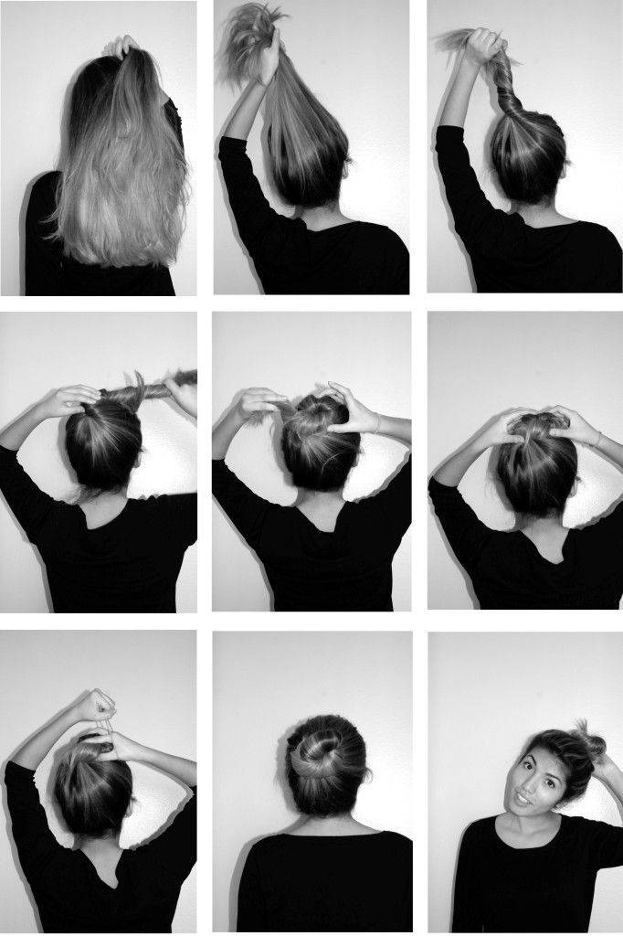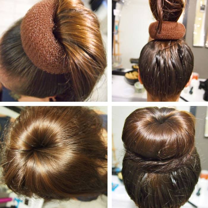 - Продеть бублик: сформировать пучок, закрепляя шпильками волосы.