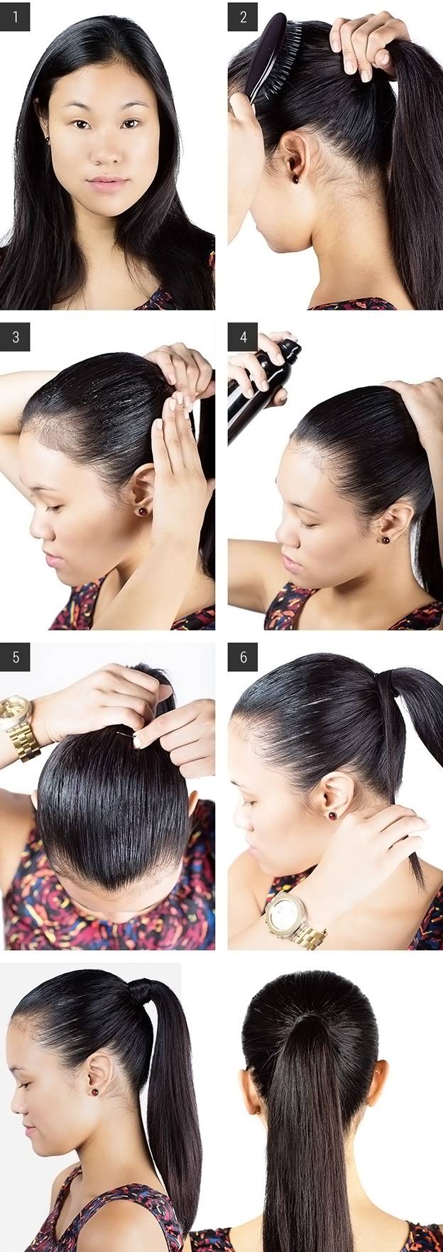 Шаг 3-4-5-6. Просуньте пальцы в образовавшееся под резинкой свободное пространство и аккуратно протащите сквозь него кончик хвоста. Зафиксируйте кончики хвоста невидимками. Перед этим, для более стильного и аккуратного вида, оберните им резинку. Расправьте пучок. Прическу зафиксируйте подходящим лаком.