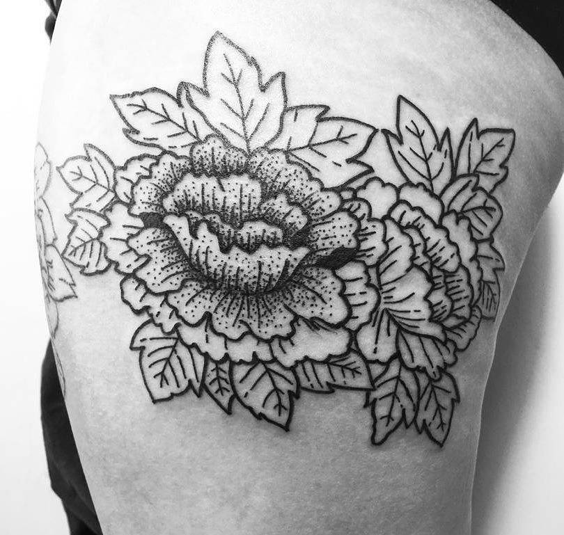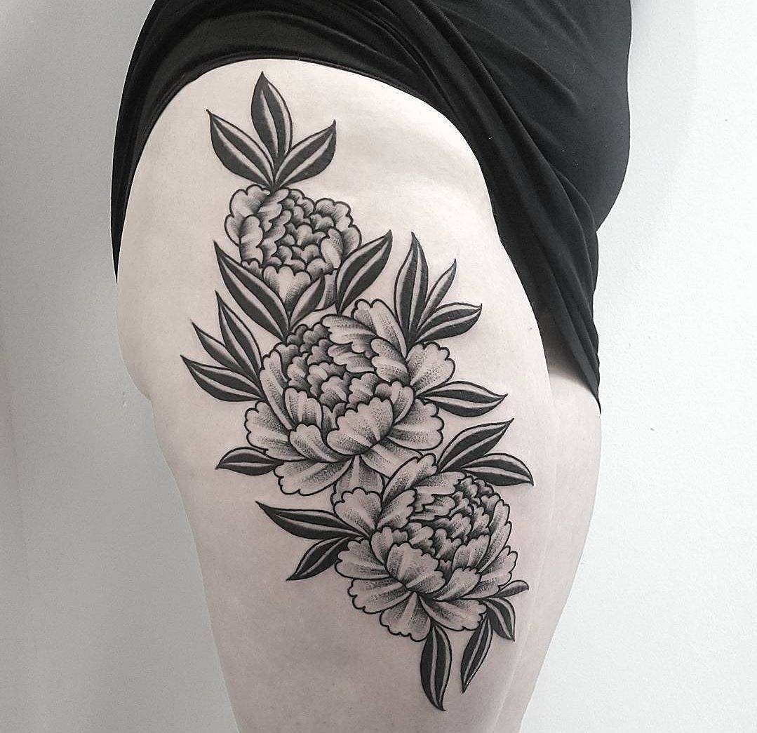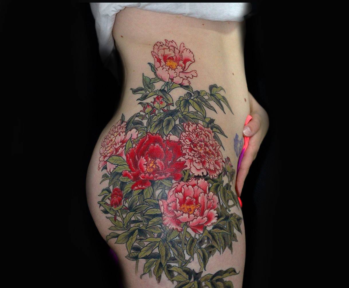 - На бедрах пионы хорошо сочетаются с животными или различными цветами, также здесь принято создавать больше картины, как на «рукавах». Пользуются спросом абстрактные картины с кружевами, подчеркивающие сексуальность девушки.