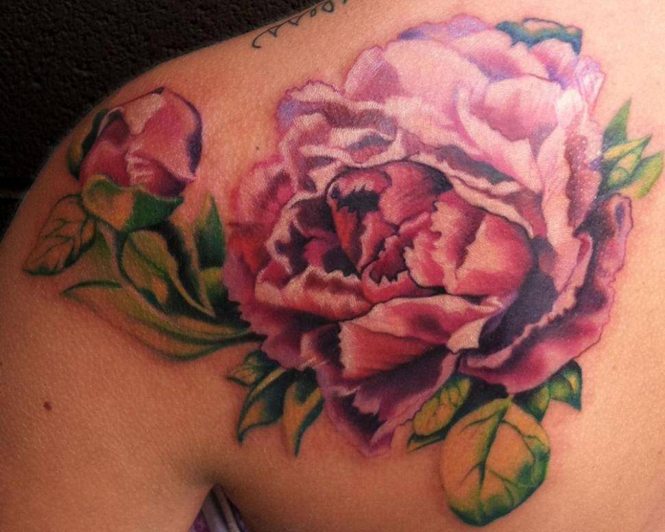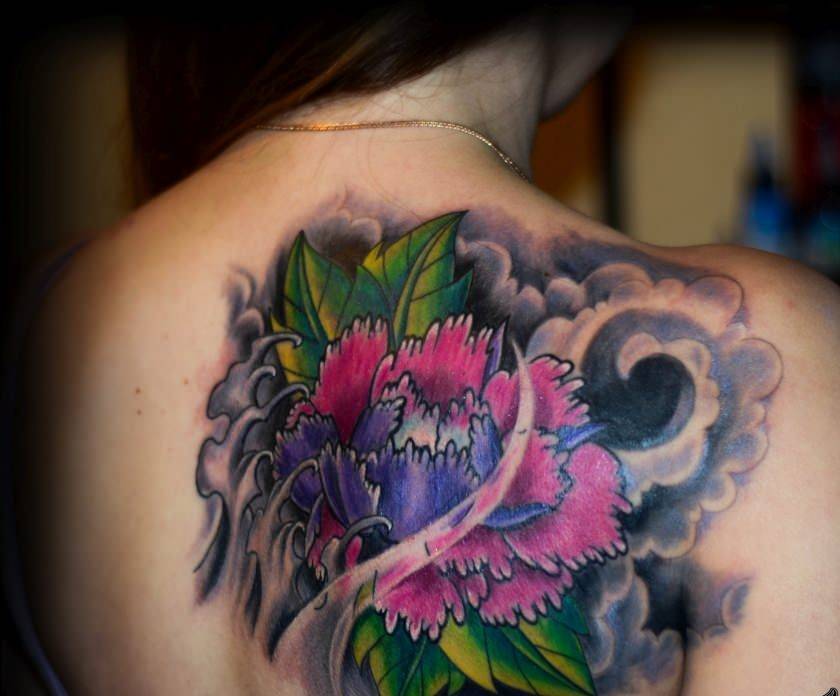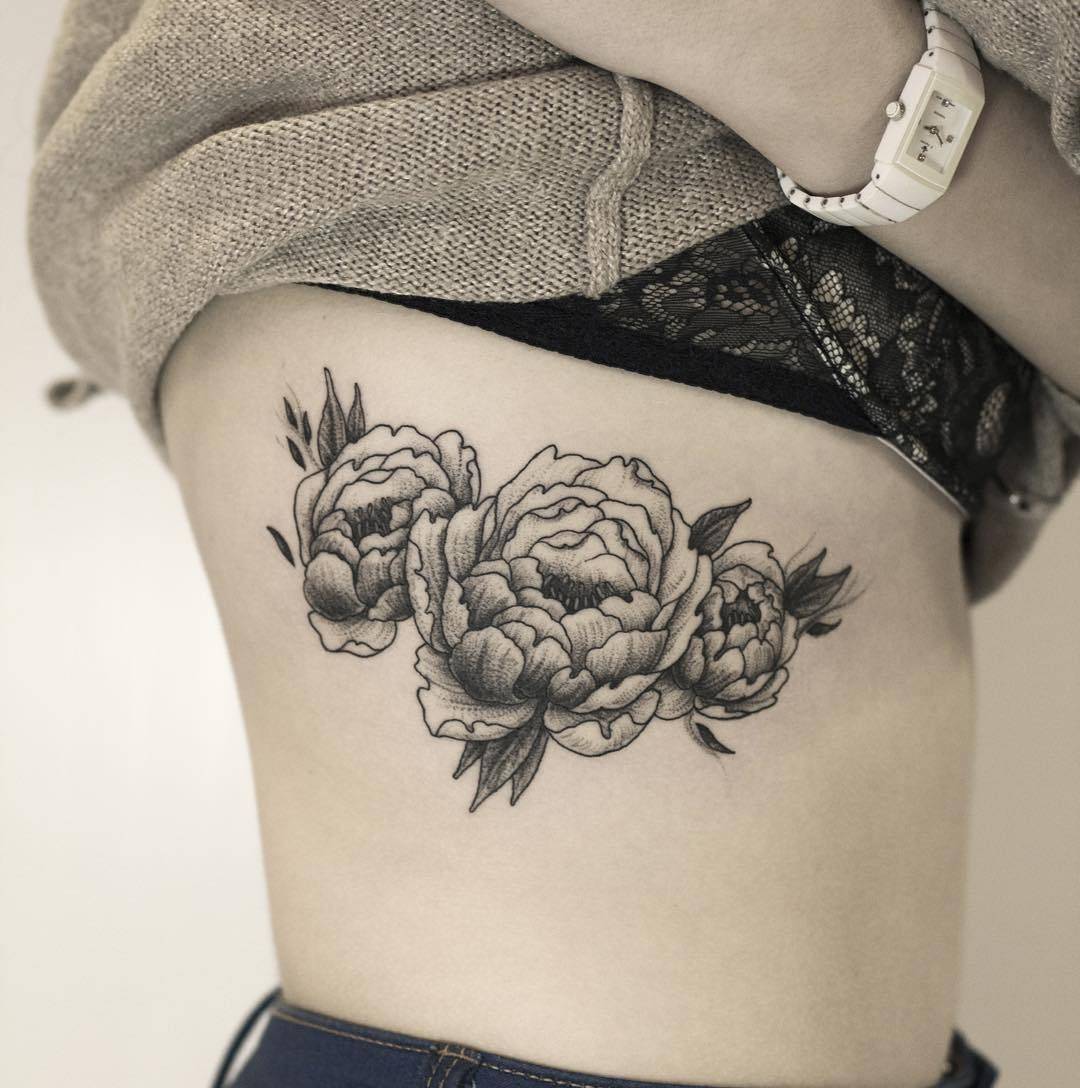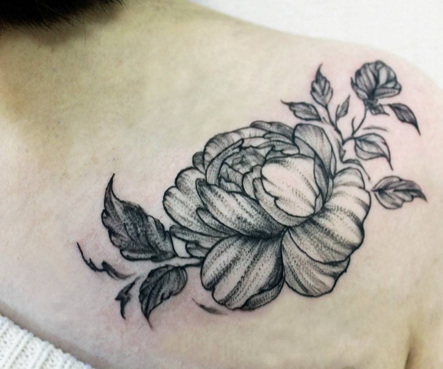Тату пион на лопатке, ребрах или ключице: