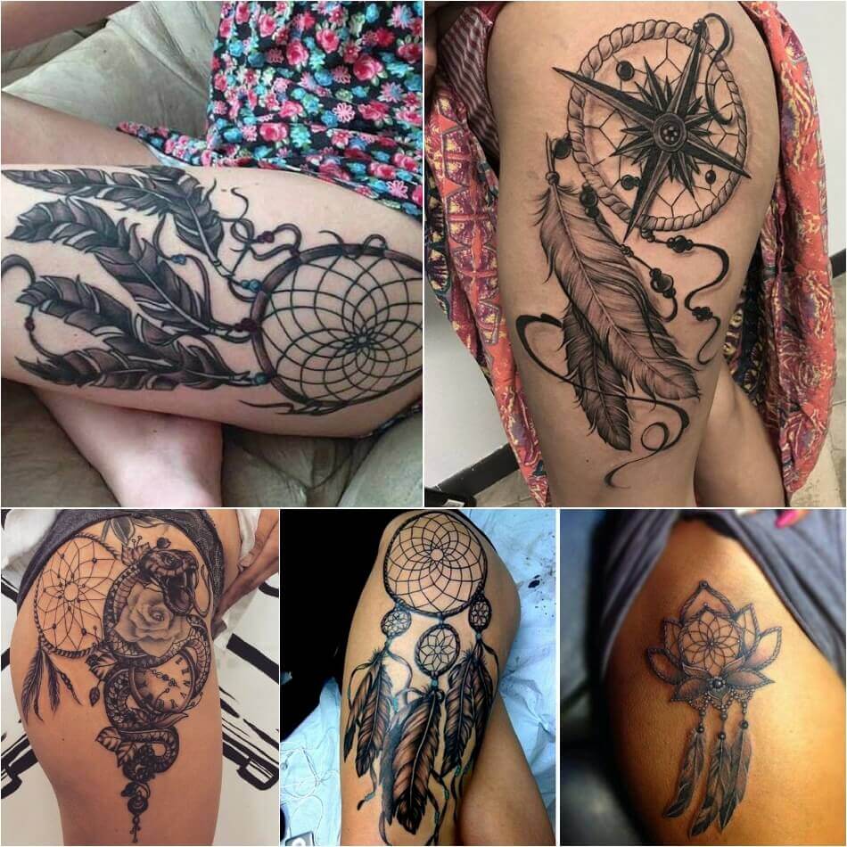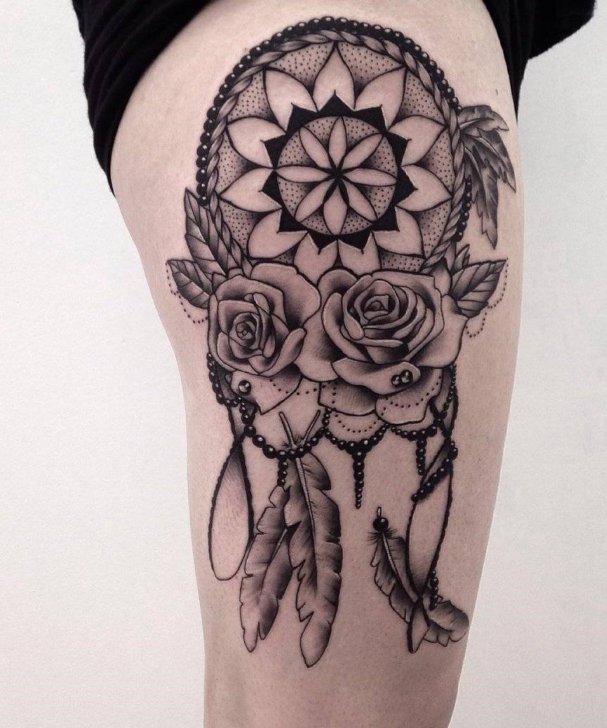 Бедро – это потрясающее место на теле у женщин для нанесения ловца снов. Большая площадь кожного покрова, позволяющая воплотить в жизнь самые смелые идеи, и возможность скрыть рисунок, при надобности, от посторонних глаз нередко привлекают дам набить талисман именно на этой области.