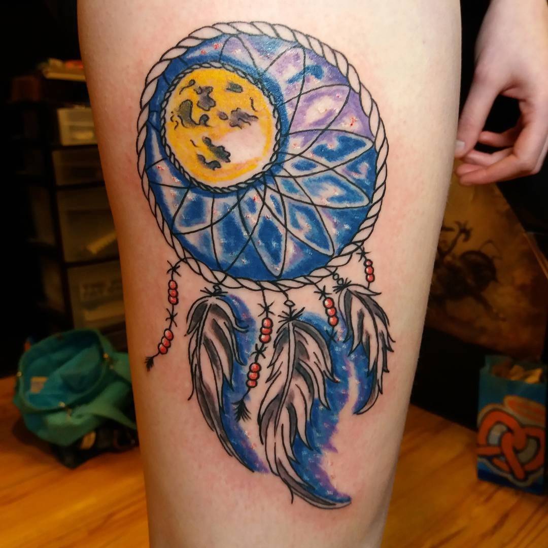 Тату ловец снов на бедре акварель