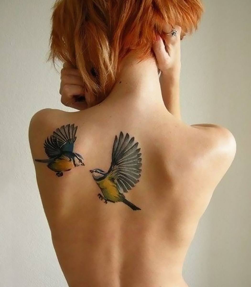 Выбор татуировок у девушек практически не ограничен. Если мужчина с опаской отнесется к эскизу с бабочкой или птичкой, то на женском теле они будут вполне уместно. В качестве изображения выбираются насекомые, экзотические птицы, даже сказочные персонажи.