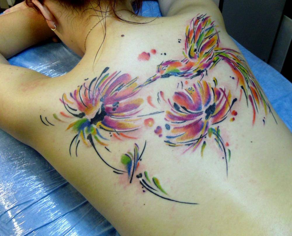 Сама зона нанесения рисунка нейтральна. Значение тату зависит лишь от изображенных символов, их цветовой гаммы, стилистики. Фото женских татуировок на спине поражают своим разнообразием и выполняются в разных цветах. Разберем наиболее востребованные варианты.