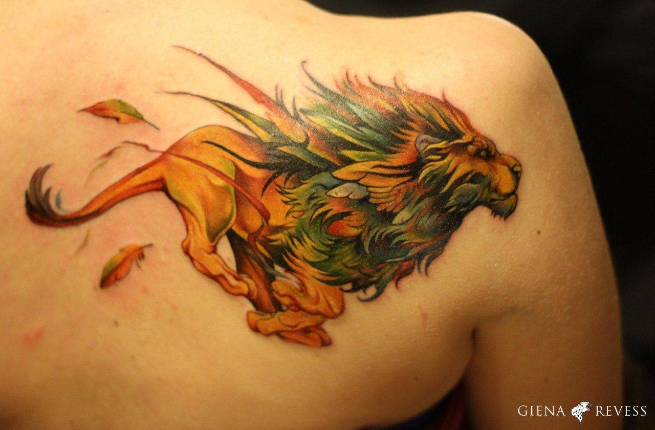 Тату лев во всю спину у мужчины