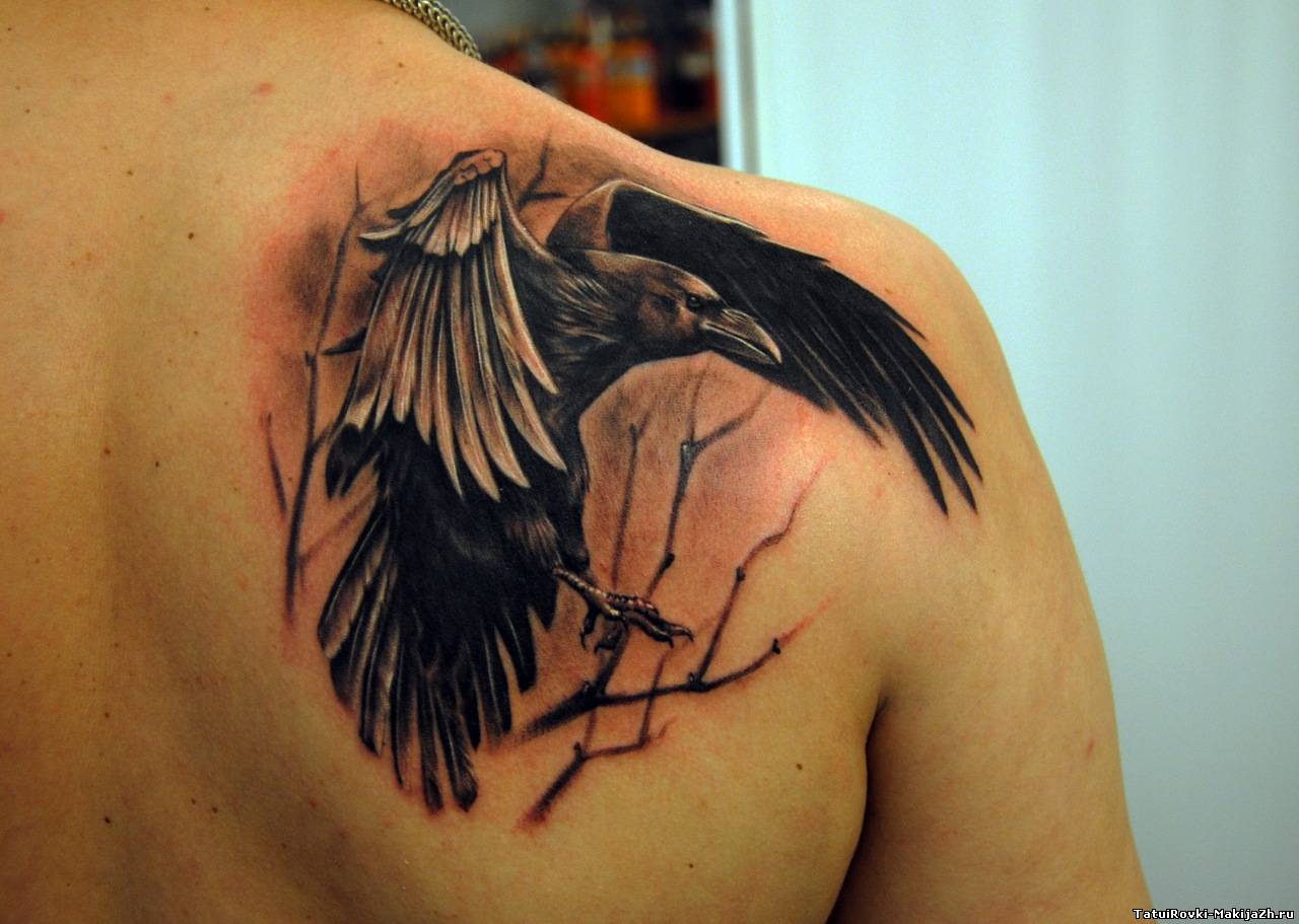 Большое пространство на лопатке дает простор для фантазии заказчика. Размер и форма татуировки может быть абсолютно любой, ведь она сможет плавно переходить на плечи и предплечья. Некоторые эскизы допускают плавный спуск по спине или переходом на один бок.
