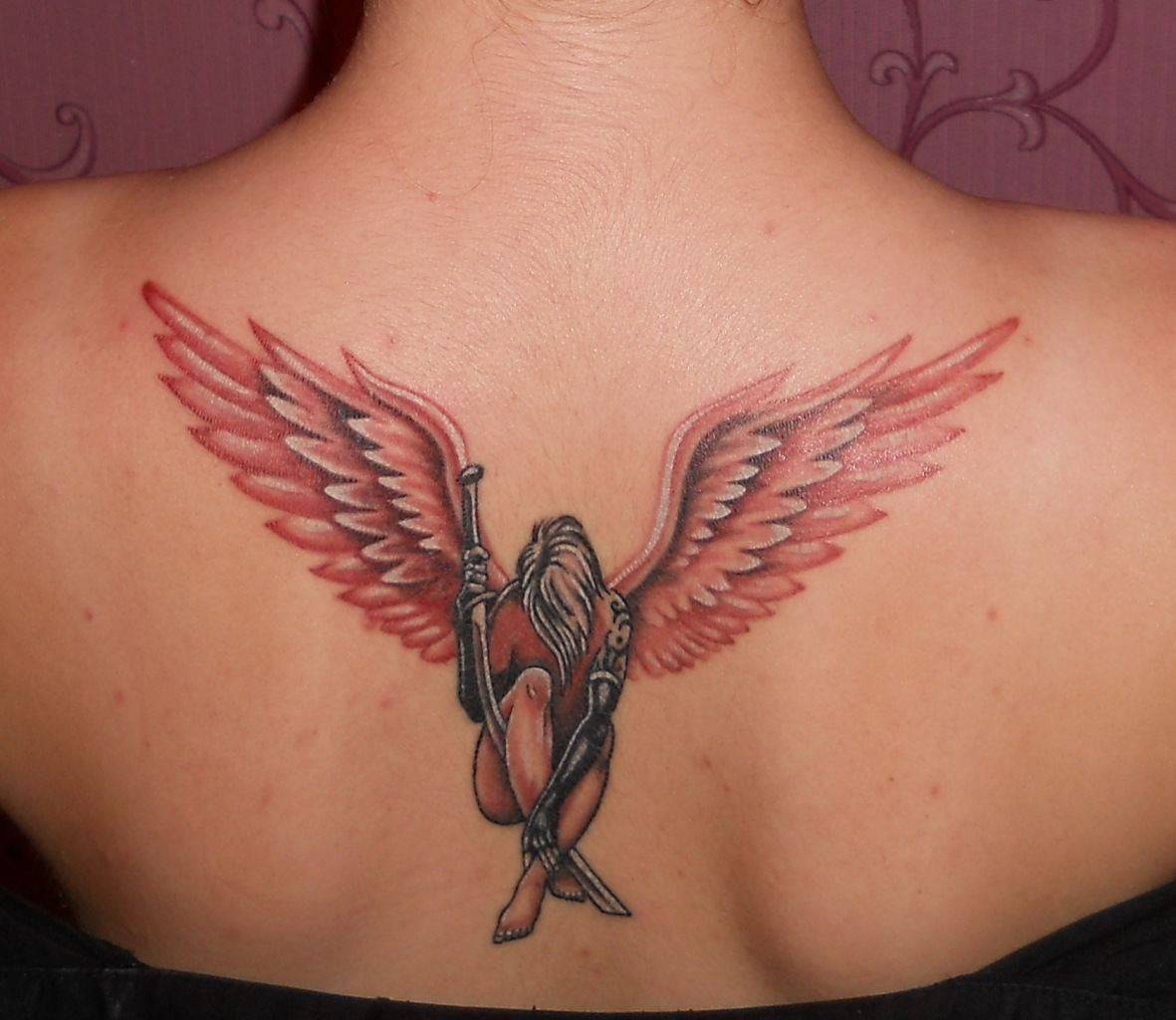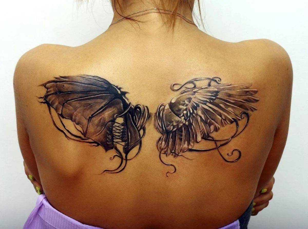 В общем смысле татуировка с изображением крыльев имеет значение свободы, возвышенности, скорости и стремления к цели. Изображение крыльев на спине может быть в сложенном или развернутом виде, по всей поверхности спины или только на верхней части – это зависит от пожелания девушки.