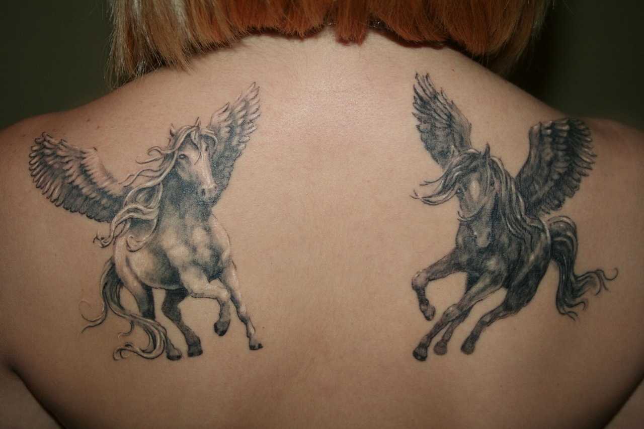 Нередко используют крылья мифологических существ в качестве эскиза, но в отличие от крыльев ангела, здесь изображается сам персонаж. Используют образы пегасов, грифонов, фей, фениксов и даже драконов. Общее значение подобных татуировок — преображение изнутри, приверженность в мистике, магические способности, символ природных составляющих.