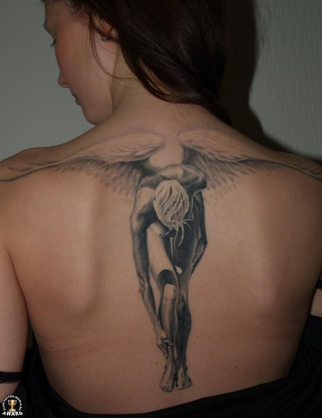 Иногда девушки выбирают изобразить на спине не только ангельские крылья, но и образ ангела полностью.